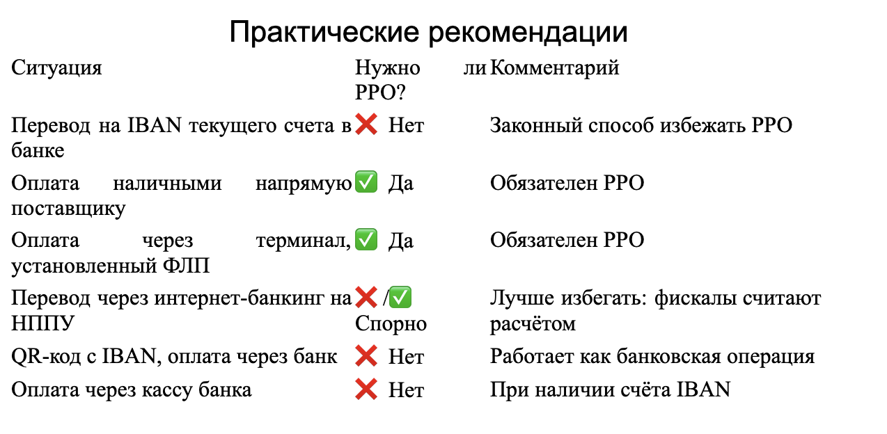 Позиция ГНСУ: Если средства переводятся не на счёт в банке, а на платежный счёт, открытый у НППУ, налоговая трактует такую операцию как расчётную, что обязывает применять РРО.
