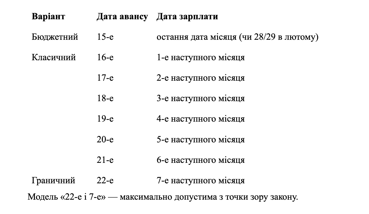 - Граничні дати виплат: аванс — до 22-го числа, остаточна заробітна плата — до 7-го числа наступного місяця.